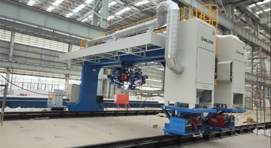 車間內(nèi)有1個(gè)龍門焊接機(jī)器人,機(jī)器人在軌道上移動(dòng),工件尺寸較大,需行車搬運(yùn)。