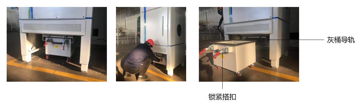 采用機械導(dǎo)軌使灰桶與灰斗配合,只要操作機械手柄開關(guān),就能實現(xiàn)灰桶自動升降,通過搭扣實現(xiàn)灰桶壓緊功能,方便倒灰,省時省力。其他氣動、電動方式既需要產(chǎn)生電能、氣能的消耗,又不便于灰桶滿載操作,因為重量非常重,對氣缸氣囊等產(chǎn)生磨損,而且容易出機械故障。
