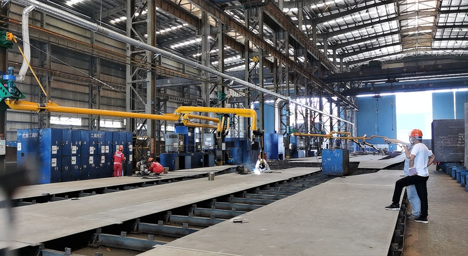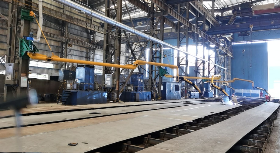 車間為鋼構(gòu)部焊接車間,共有15跨,工況為拼板打底焊、箱梁三面成型焊、四面成型焊。車間跨度30m~40m,客戶工件長(zhǎng)達(dá)80m,焊接范圍大,工件需吊裝。