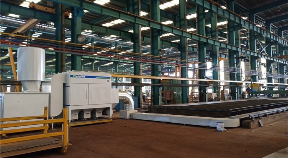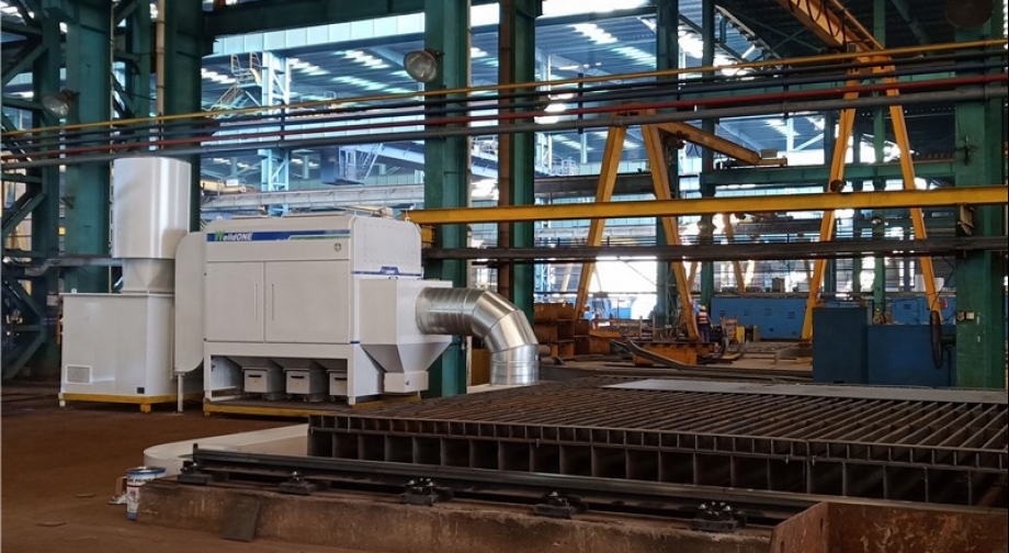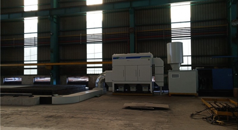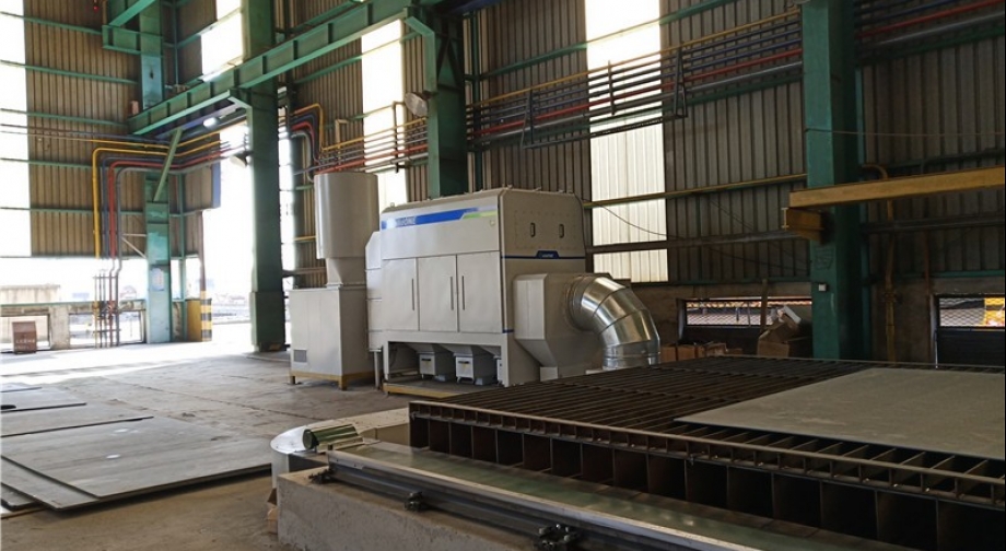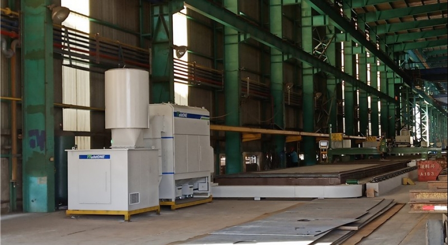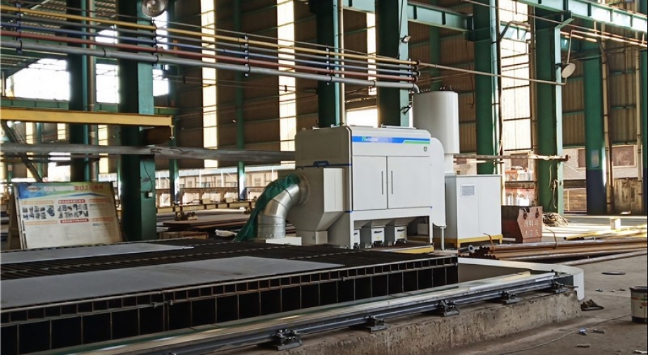 車間內(nèi)采用12套8m×30m等離子切割機(jī),等離子電源400A,切割平臺(tái)跨距大,若采用雙側(cè)吸風(fēng)除塵系統(tǒng),平臺(tái)中間部分吸煙困難。另外板材邊緣坡口切割煙塵捕捉困難。