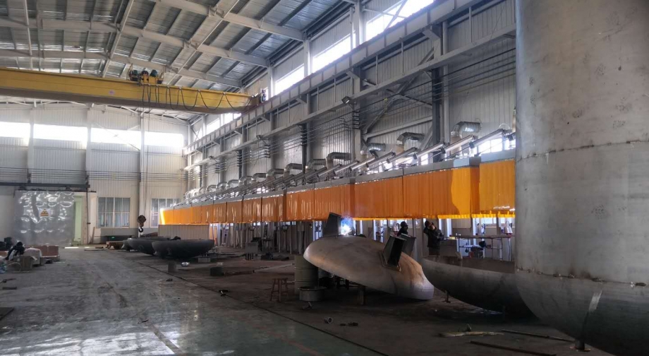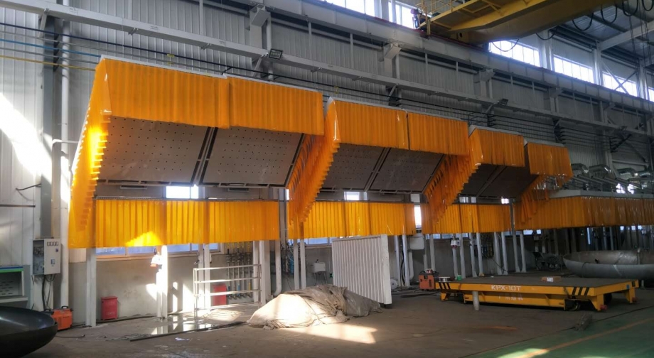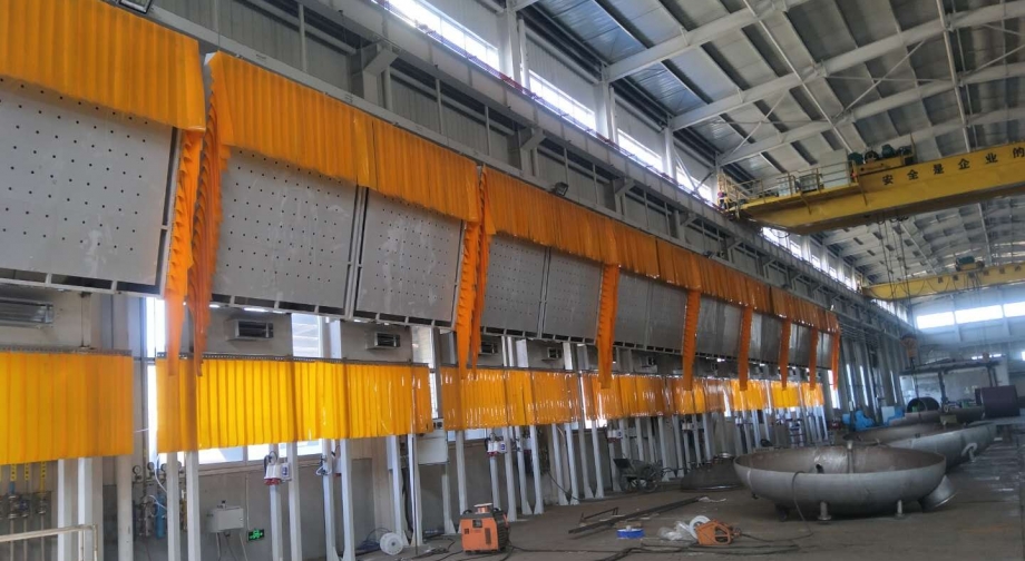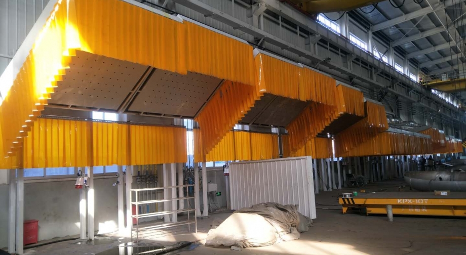 需治理車間為大型設(shè)備手工焊接生產(chǎn)線,工件裝卸采用行車吊裝,現(xiàn)有生產(chǎn)工位10個,每個工位跨度為6米,其中7個焊接工位,1個小件打磨工位,2個大件打磨工位,客戶要求10個工位共用一臺除塵主機。