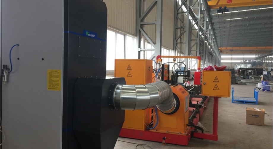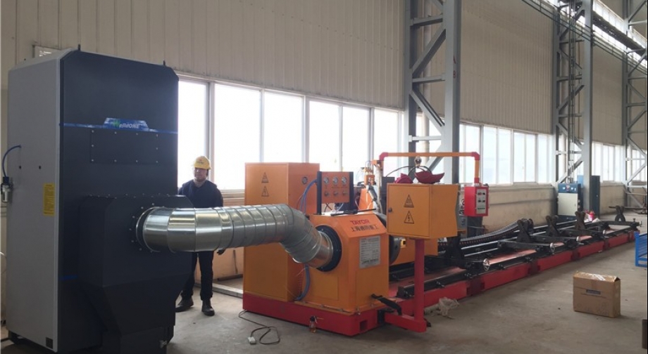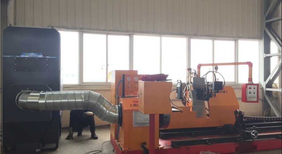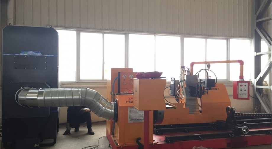 采用頂端抽吸式治理方式,設(shè)計將相貫線切割機(jī)端頭卡盤與除塵管道相連,切割產(chǎn)生的煙塵在管材內(nèi)受到端頭除塵主機(jī)吸力作用下抽走,朂終進(jìn)入除塵主機(jī),經(jīng)除塵主機(jī)凈化后達(dá)標(biāo)排放。為了防止切割過程中火花帶來的安全隱患,除塵主機(jī)入口處設(shè)火花分離器。
