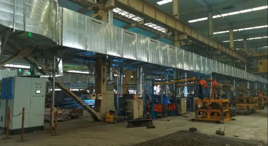 采用吹吸式整體治理方式,沿車間長度方向,送、回風(fēng)管相對布置,送、回風(fēng)口均勻的布置在風(fēng)管上,除塵系統(tǒng)開啟后焊接煙塵被不斷的被收集起來,以此達到焊接煙塵整體治理的目標(biāo)。除塵設(shè)備采用組合式風(fēng)柜機組,春、夏、秋季全新風(fēng)工況運行(處理后的空氣外排),冬季采用部分新風(fēng)工況(處理后的部分空氣和新風(fēng)混合后再次送入室內(nèi))。