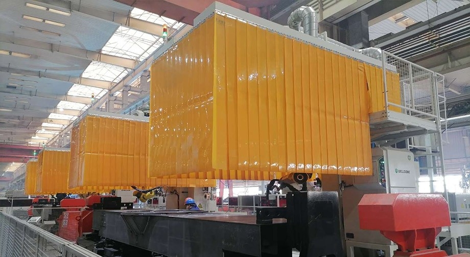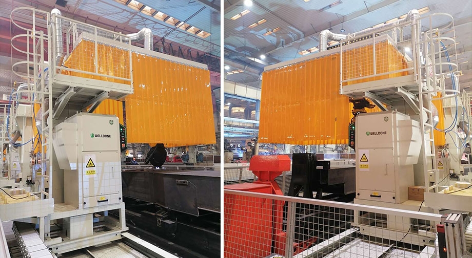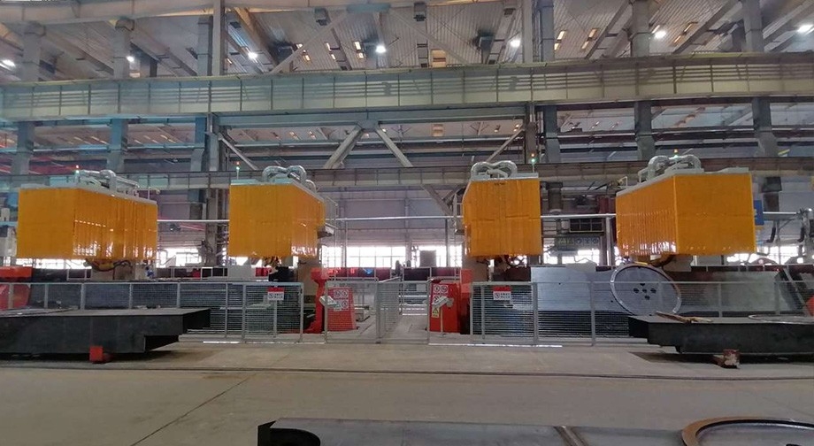 4臺(tái)機(jī)器人焊接,行車(chē)搬運(yùn)工件,焊接工件尺寸較大,機(jī)器人在軌道上沿長(zhǎng)度方向移動(dòng)。