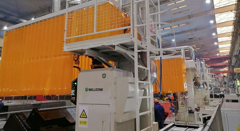 采用吸氣罩的治理方式,在工件焊接范圍上方設(shè)計(jì)吸氣罩,除塵設(shè)備置于平臺(tái)上,吸氣罩、除塵設(shè)備隨機(jī)器人移動(dòng),工件搬運(yùn)時(shí),吸氣罩隨機(jī)器人移至一側(cè)。機(jī)器人焊接產(chǎn)生的煙塵在熱源的作用下擴(kuò)散至吸氣罩內(nèi),通過(guò)罩內(nèi)負(fù)壓送入除塵管路系統(tǒng)朂終進(jìn)入除塵主機(jī),每個(gè)機(jī)器人配套一臺(tái)除塵主機(jī)。