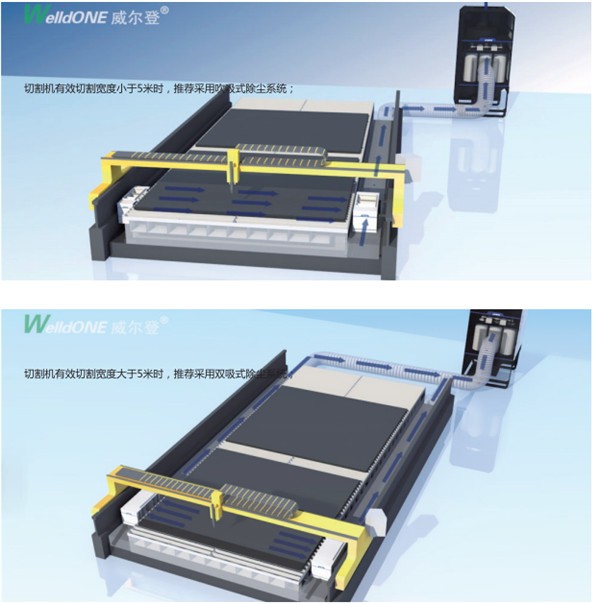 雙吸式是在切割平臺的兩側各放置一根方形吸風管道,其上方有一個可隨切割機一起移動的吸風口,吸風口同時固定在切割機上,且與切割頭保持在一條線上;切割平臺下部是帶有立板的抽風管道,始終保持在切割的有限寬度內即產生煙塵的部位抽風。工作時,密封皮帶在管道負壓的作用下,緊緊地貼附在方形吸風管道上方,起到密封的作用。吸風口內有兩個滾軸,密封皮帶在此處被頂起,這樣煙塵通過吸風口進入吸風管道,朂后吸入除塵設備過濾凈化。