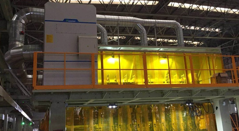 車間內(nèi)有一龍門(mén)架U型箱梁專機(jī)焊工位,共有6把專機(jī)焊槍,焊槍伸到U型箱梁內(nèi)部焊接,煙塵集聚在工件內(nèi)部,從開(kāi)孔和端頭逸散。