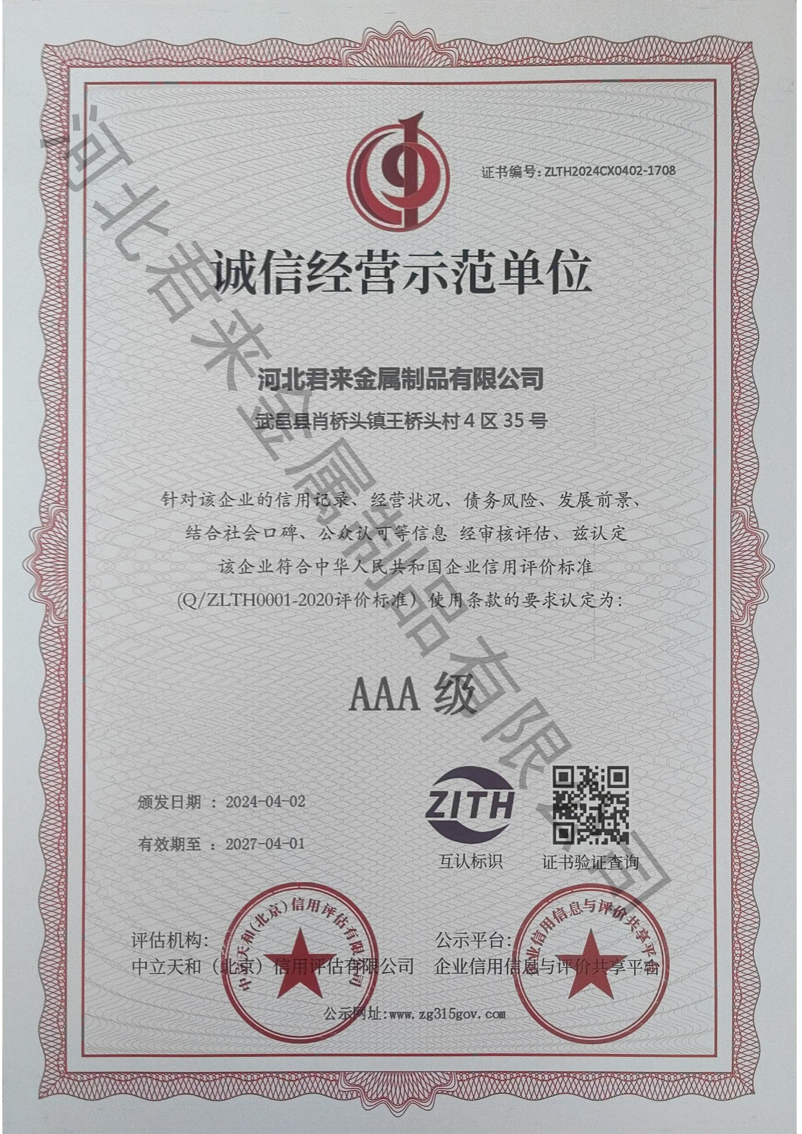 誠信經(jīng)營示范等級(jí)證書