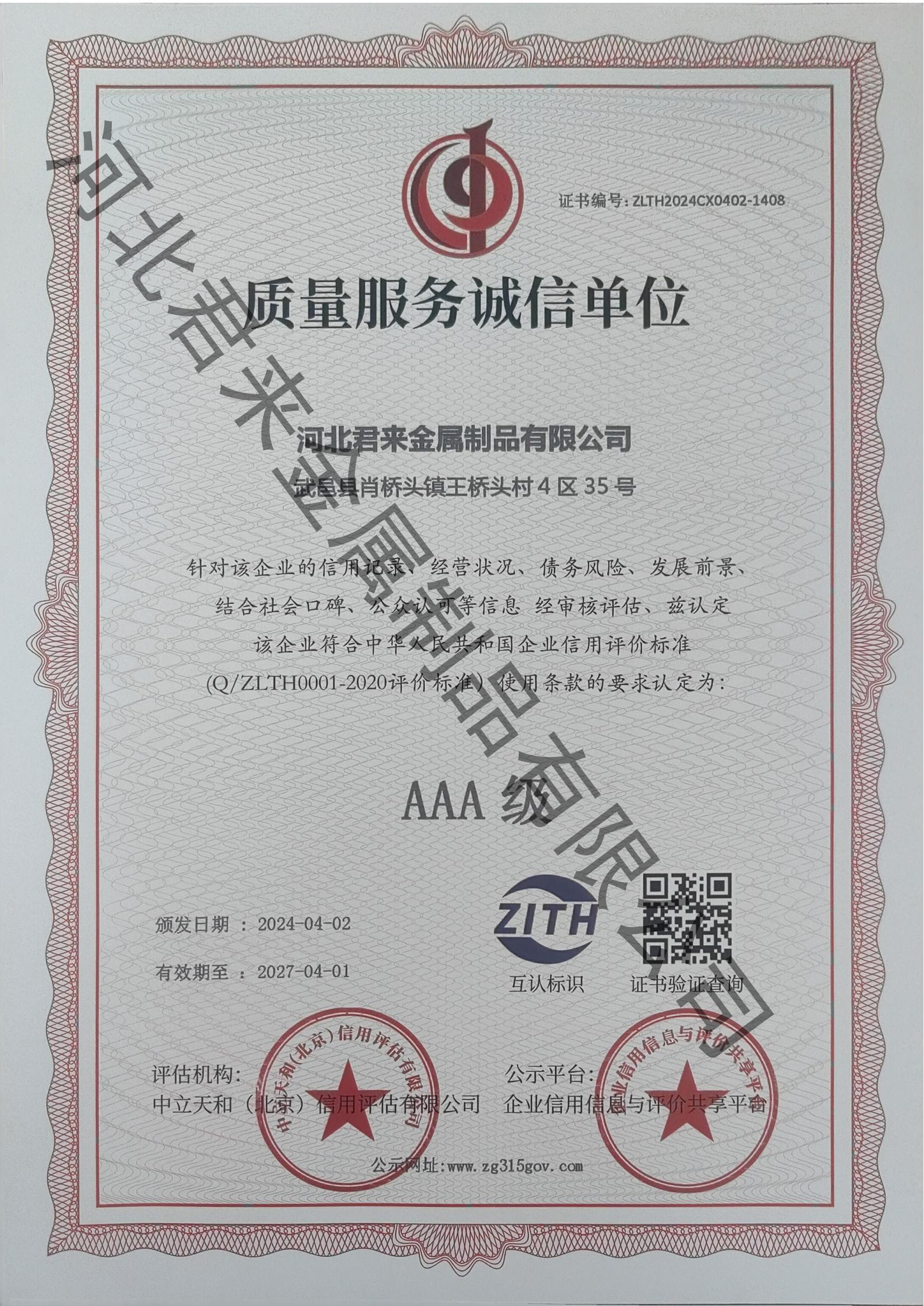 質(zhì)量服務(wù)誠信等級(jí)證書