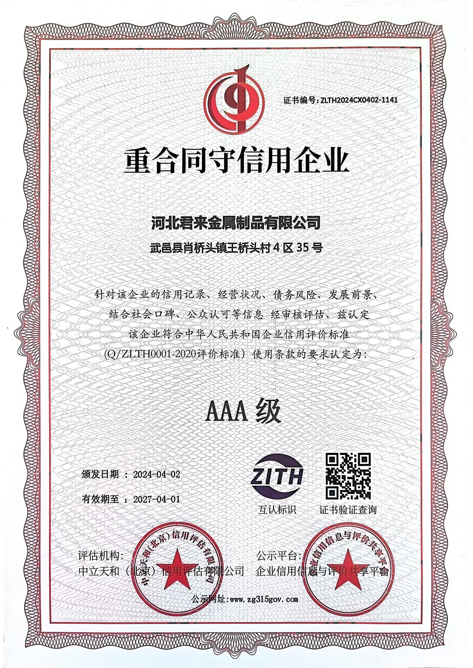 重合同守信用等級(jí)證書