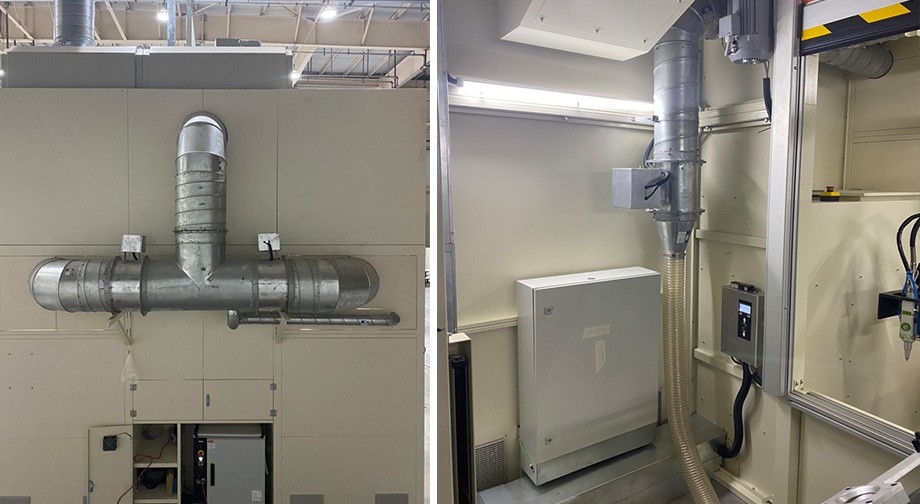 采用工作站除塵系統(tǒng)形式,工作站將焊接區(qū)域包圍,在工作站側(cè)上方設(shè)置吸塵口,焊接產(chǎn)生的煙塵在熱源的作用下擴(kuò)散,經(jīng)除塵管道送入除塵主機(jī)中凈化后排至室外,根據(jù)現(xiàn)場情況及客戶要求,除塵設(shè)備采用非標(biāo)臥式結(jié)構(gòu)。